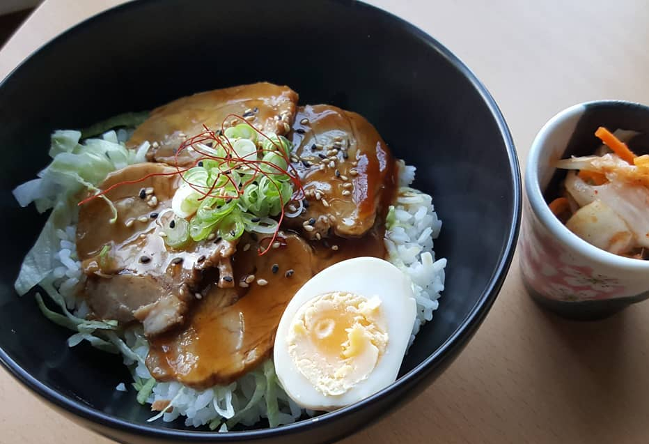 Chashu skivor med glaserad sås serveras tillsammans med sallad och ris i en djup skål. Don är maträtt som består av bädd av ris och andra matvaror exempelvis kött/fisk lags ovanpå. Man får alltså alla maträtter i en skål.