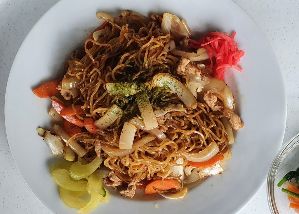 Japanska stekta nudlar med fläskkött och grönsaker. En av populära helglunch i Japan. Enkel, snabb, god och omtyckt av alla ålder. Bläckfisk är också vanlig i yakisoba. Benishoga (röd inlagd ingefära) ger extra uppfriskande smak här också.