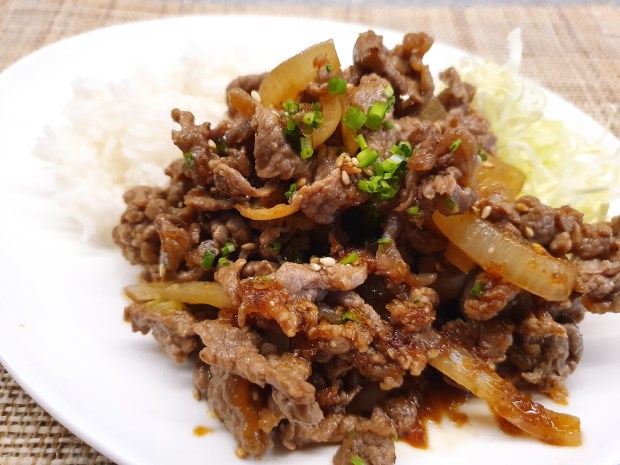 Tunt skivat nötkött marineras i god blandning med soja, sesamolja, vitlök m.m Sedan stekas köttet hastigt så att det håller saftigt och lättuggat. Serveras med extra hemgjord yakiniku sås.